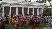 Upacara digelar di halaman Gedung Pancasila Kemenlu. Jokowi tampak mengenakan pakaian adat khas Jawa lengkap dengan blankon sebagai penutup kepala.
